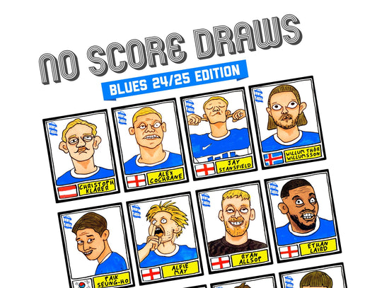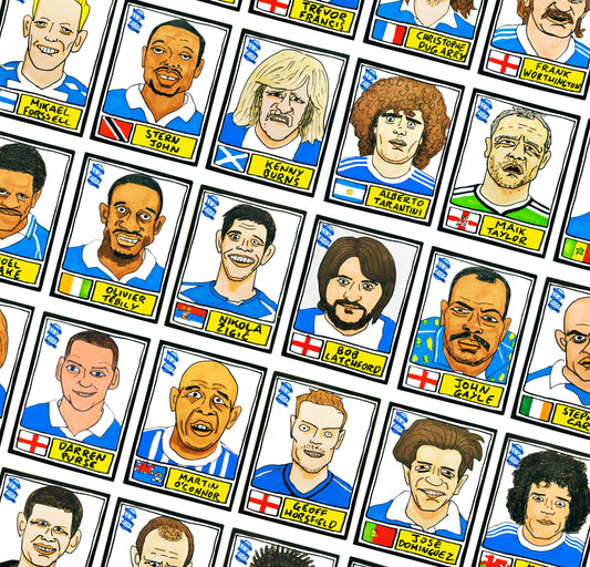 Birmingham City - No Score Draws Blues Edition - A3 print of 36 hand-drawn Panini-style footy sticker legends - Cheapskate football art