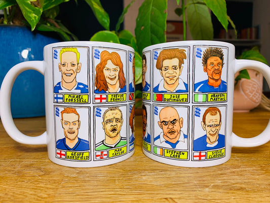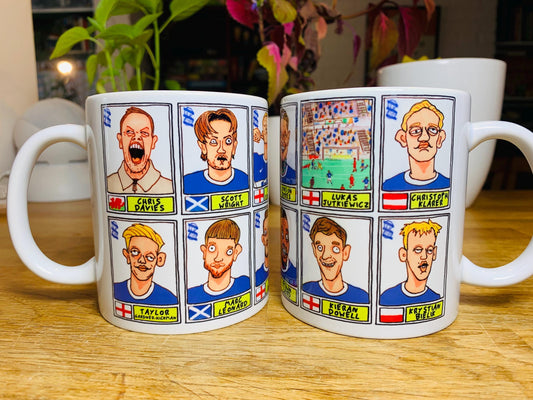 Birmingham City - Set of TWO 11oz Ceramic Mugs with Wonky Panini sticker-style No Score Draws Doodles of 24 BCFC Blues icons