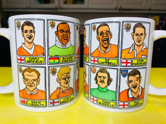 Blackpool No Score Draws Mug Set - Set of TWO 11oz Ceramic Mugs with Wonky Panini sticker-style BFC Tangerines No Score Draws Doodles