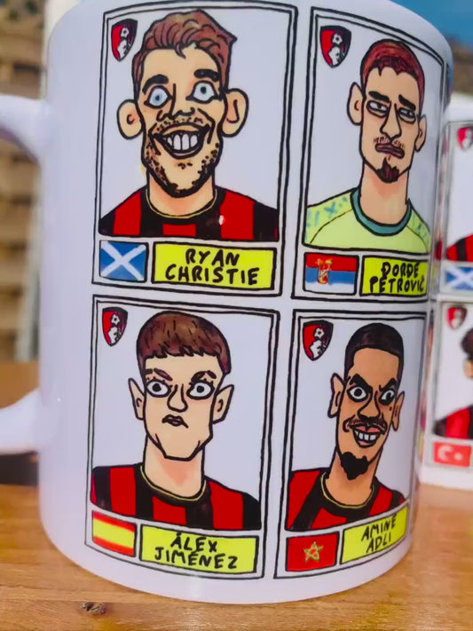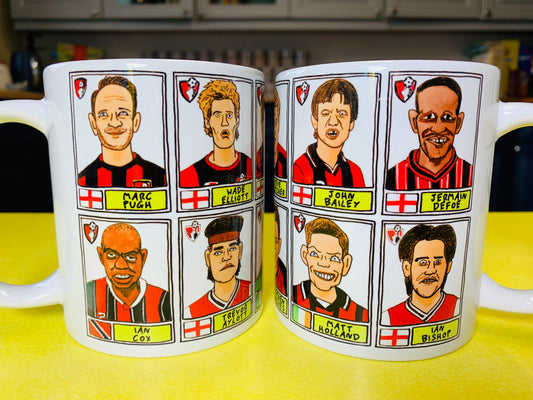 Bournemouth Legends No Score Draws Mug Set - Set of TWO 11oz Ceramic Mugs with Wonky Panini-style AFCB Cherries No Score Draws Doodles
