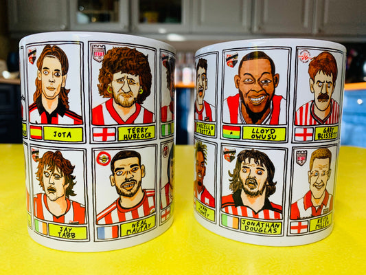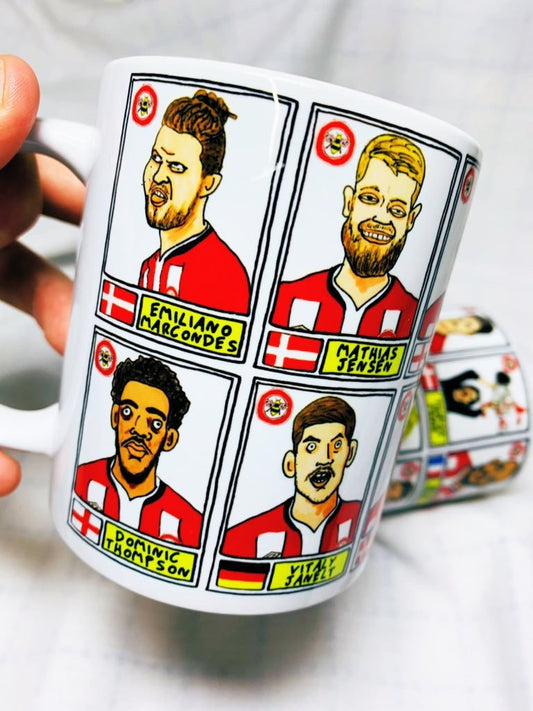 Brentford Vol 3 No Score Draws Mug Set - Set of TWO DIFFERENT 11oz Ceramic Mugs with Wonky Panini-Style Doodles Of Thomas Frank's 24/25 Team