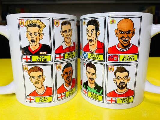 Bristol City No Score Draws Mug Set - Set of TWO 11oz Ceramic Mugs with Wonky Panini sticker-style No Score Draws Doodles of BCFC icons