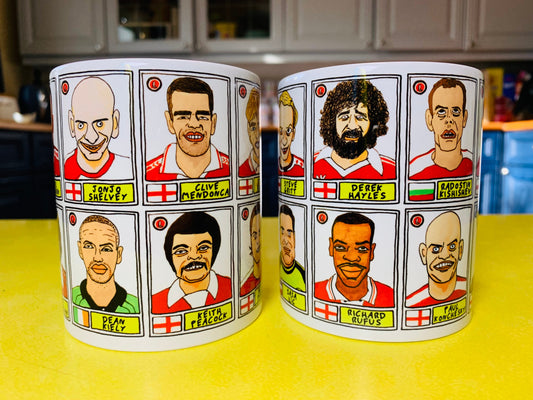 Charlton Athletic No Score Draws Mug Set - Set of TWO 11oz Ceramic Mugs with Wonky Panini sticker-style No Score Draws Doodles of CAFC icons