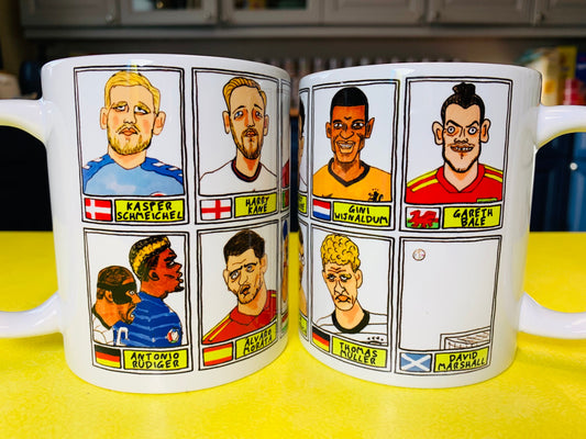 Euro 2020 No Score Draws Mug Set - Set of TWO 11oz Ceramic Mugs with 24 Wonky Panini sticker-style Euro 2020 No Score Draws Doodles