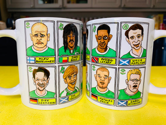 Hibs No Score Draws Mug Set - Set of TWO 11oz Ceramic Mugs with Wonky Panini sticker-style No Score Draws Doodles of 24 Hibernian icons