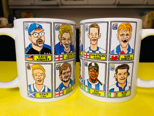 Huddersfield Town No Score Draws Mug Set - Set of TWO 11oz Ceramic Mugs with Wonky Panini sticker-style Terriers No Score Draws Doodles
