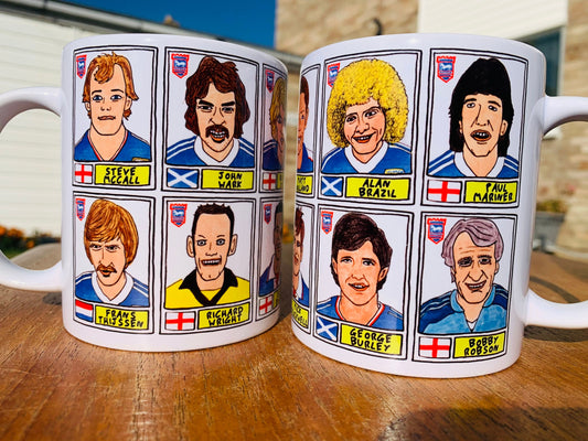 Ipswich Town Mug Set - Set of TWO 11oz Ceramic Mugs with Wonky Panini sticker-style No Score Draws Doodles of 24 ITFC Tractor Boys icons