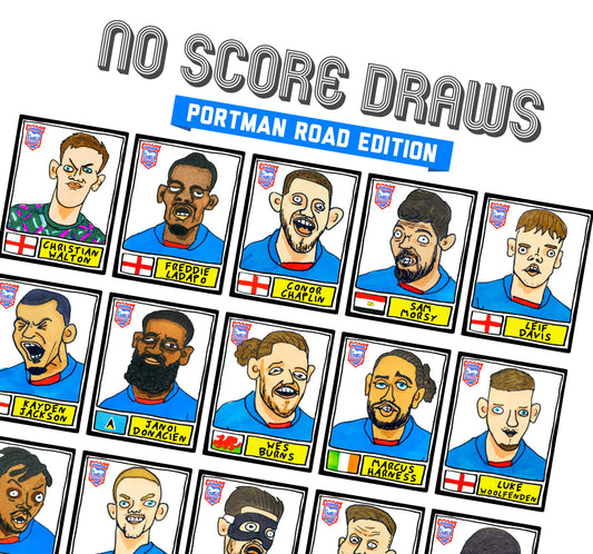 Ipswich Town - No Score Draws Tractor Boys Edition - A3 print of 36 hand-drawn Panini-style footy sticker legends - Cheapskate football art