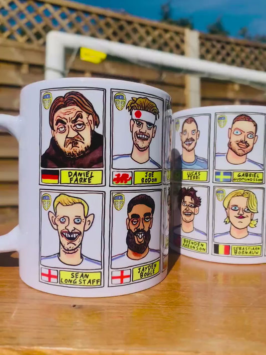 Leeds United 25/26 No Score Draws Mug Set - Set of TWO DIFFERENT 11oz Ceramic Mugs with Wonky Panini-Doodles Of Daniel Farke's PL Squad