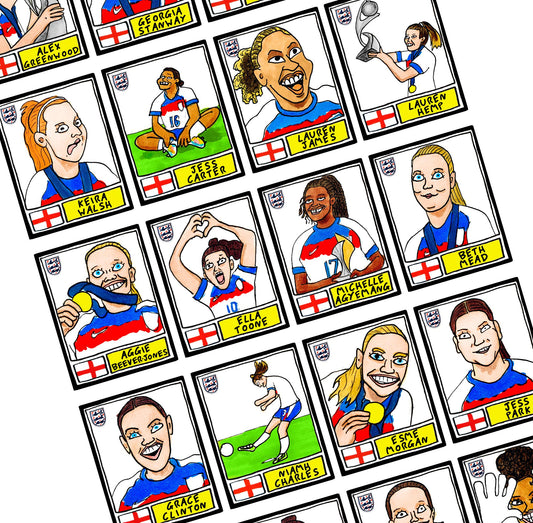 England Lionesses Vol 3 - No Score Draws Lionesses '25 Edition - A3 print of 24 wonky Panini-doodles of England Women's Euro 2025 WINNERS