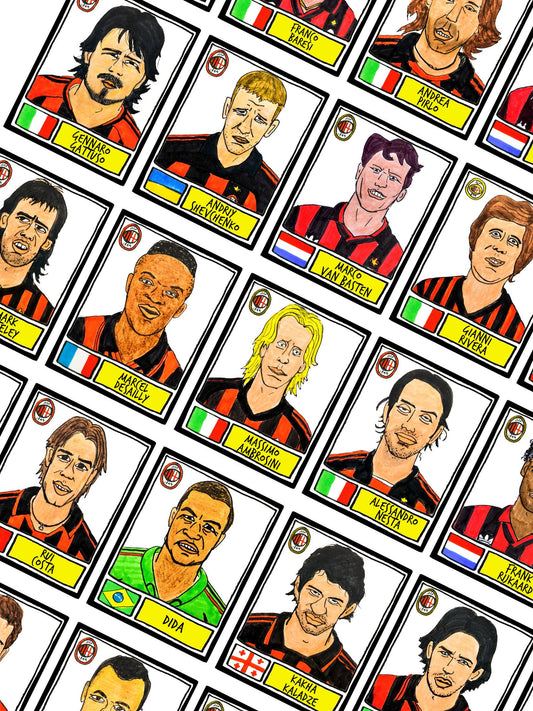 AC Milan - No Score Draws Rossoneri Edition - A3 print of 36 hand-drawn Panini-style football sticker legends - Cheapskate football art