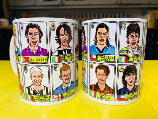 Football Italia No Score Draws Mug Set - Set of TWO 11oz Ceramic Mugs with Wonky Panini sticker-style 90s Serie 'A' No Score Draws Doodles