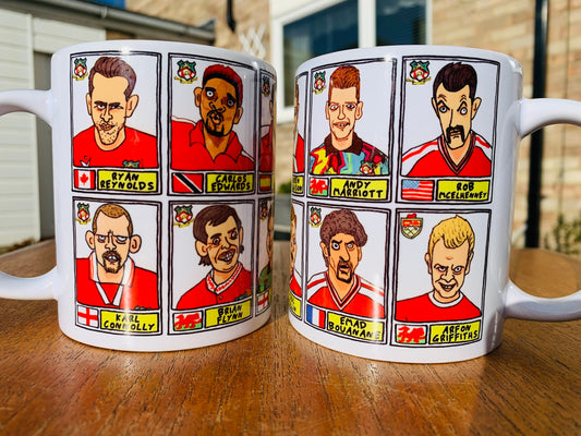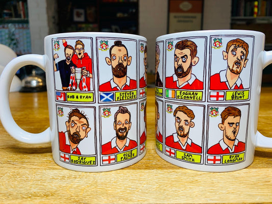 Wrexham Vol 4 No Score Draws Mug Set - Set of TWO DIFFERENT 11oz Ceramic Mugs with Wonky Panini-Doodles Of WFC's 24/25 Promotion Squad