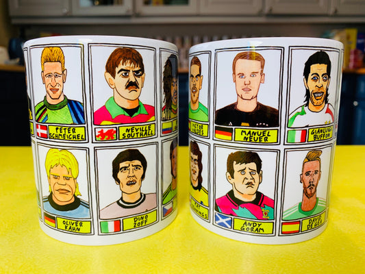 Goalkeeping Icons No Score Draws Mug Set - Set of TWO 11oz Ceramic Mugs with Wonky Panini sticker-style No Score Draws Doodles of GK icons