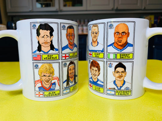QPR No Score Draws Mug Set - Set of TWO 11oz Ceramic Mugs with Wonky Panini sticker-style Queens Park Rangers No Score Draws Doodles