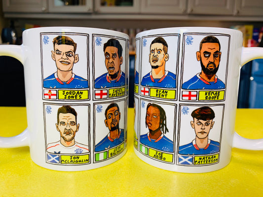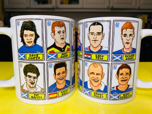 Rangers Volume 2 No Score Draws Mug Set - Set of TWO 11oz Ceramic Mugs with Wonky Panini sticker-style doodles of Rangers 20-21 SPL Champs