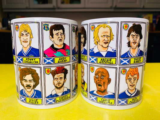 Scotland No Score Draws Mug Set - Set of TWO 11oz Ceramic Mugs with Wonky Panini-style No Score Draws Doodles of 24 Scottish Fitba icons
