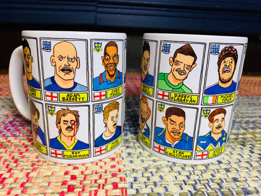 Southend United No Score Draws Mug Set - Set of TWO 11oz Ceramic Mugs with Wonky Panini sticker-style doodles of 24 Shrimpers Football Icons