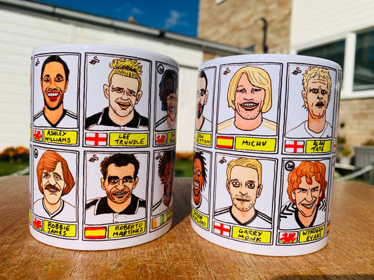 Swansea City No Score Draws Mug Set - Set of TWO 11oz Ceramic Mugs with Wonky Panini sticker-style No Score Draws Doodles of 24 Swans icons