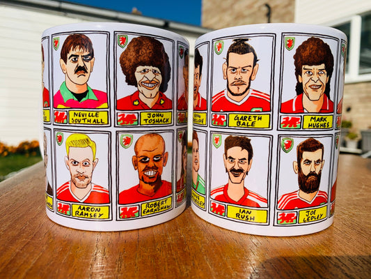 Wales No Score Draws Mug Set - Set of TWO 11oz Ceramic Mugs with Wonky Panini sticker-style No Score Draws Doodles of 24 Cymru icons