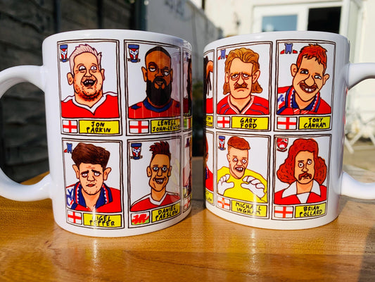 York City No Score Draws Mug Set - Set of TWO DIFFERENT 11oz Ceramic Mugs with Wonky Panini-style No Score Draws Doodles Of 24 YCFC Legends