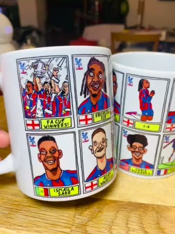 Oliver Glasner's Crystal Palace have WON THE FA CUP, so here's a set of TWO DIFFERENT mugs showcasing 24 wonky doodles of the Eagles' Wembley heroes by the idiots/amateur "artists" at No Score Draws. Please note these are two DIFFERENT mugs, showcasing 12 different FA-Cup winning Eagles drawings on each mug.